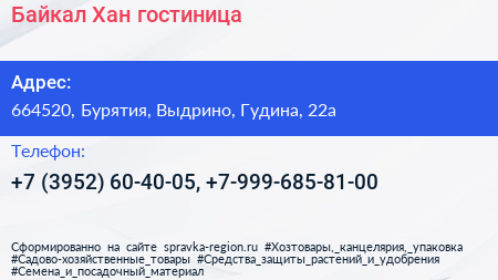 Байкал Хан, гостиница по адресу 664520, Бурятия, Выдрино, Гудина, 22а в дальнейшем Организация, размещена в следующих категориях: