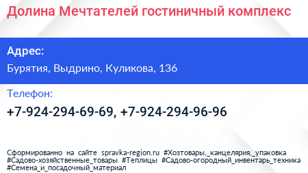 Долина Мечтателей, гостиничный комплекс по адресу Бурятия, Выдрино, Куликова, 136 в дальнейшем Организация, размещена в следующих категориях:
