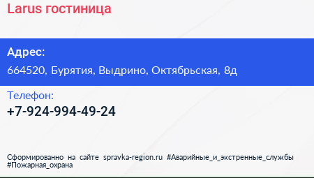 Larus, гостиница по адресу 664520, Бурятия, Выдрино, Октябрьская, 8д в дальнейшем Организация, размещена в следующих категориях: