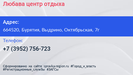 Любава, центр отдыха по адресу 664520, Бурятия, Выдрино, Октябрьская, 7г в дальнейшем Организация, размещена в следующих категориях:
