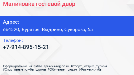 Малиновка, гостевой двор по адресу 664520, Бурятия, Выдрино, Суворова, 5а в дальнейшем Организация, размещена в следующих категориях: