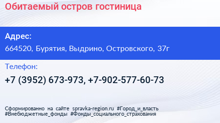 Обитаемый остров, гостиница по адресу 664520, Бурятия, Выдрино, Островского, 37г в дальнейшем Организация, размещена в следующих категориях: