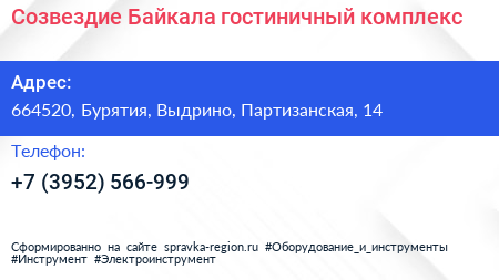 Созвездие Байкала, гостиничный комплекс по адресу 664520, Бурятия, Выдрино, Партизанская, 14 в дальнейшем Организация, размещена в следующих категориях: