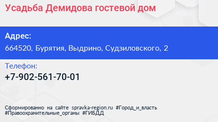 Усадьба Демидова, гостевой дом по адресу 664520, Бурятия, Выдрино, Судзиловского, 2 в дальнейшем Организация, размещена в следующих категориях: