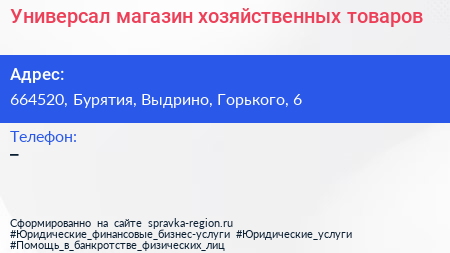Универсал, магазин хозяйственных товаров по адресу 664520, Бурятия, Выдрино, Горького, 6 в дальнейшем Организация, размещена в следующих категориях: