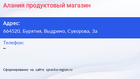 Алания, продуктовый магазин по адресу 664520, Бурятия, Выдрино, Суворова, 3а в дальнейшем Организация, размещена в следующих категориях: