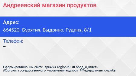 Андреевский, магазин продуктов по адресу 664520, Бурятия, Выдрино, Гудина, 8/1 в дальнейшем Организация, размещена в следующих категориях: