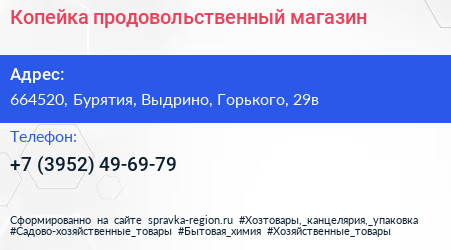 Копейка, продовольственный магазин по адресу 664520, Бурятия, Выдрино, Горького, 29в в дальнейшем Организация, размещена в следующих категориях:
