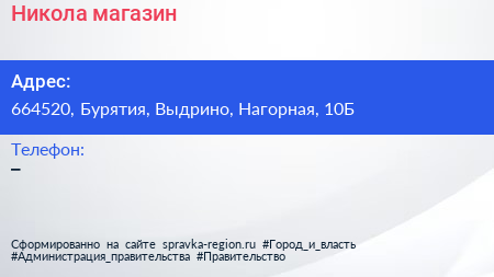 Никола, магазин по адресу 664520, Бурятия, Выдрино, Нагорная, 10Б в дальнейшем Организация, размещена в следующих категориях: