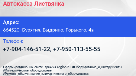 Автокасса Листвянка по адресу 664520, Бурятия, Выдрино, Горького, 4а в дальнейшем Организация, размещена в следующих категориях: