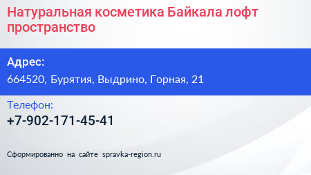 Натуральная косметика Байкала, лофт-пространство по адресу 664520, Бурятия, Выдрино, Горная, 21 в дальнейшем Организация, размещена в следующих категориях: