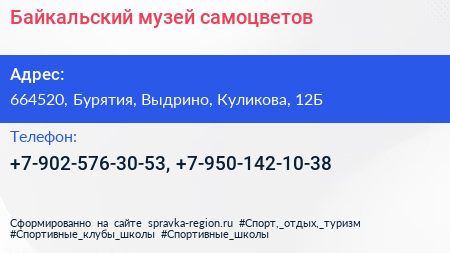 Байкальский музей самоцветов по адресу 664520, Бурятия, Выдрино, Куликова, 12Б в дальнейшем Организация, размещена в следующих категориях: