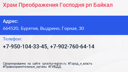 Храм Преображения Господня, рп. Байкал по адресу 664520, Бурятия, Выдрино, Горная, 30 в дальнейшем Организация, размещена в следующих категориях:
