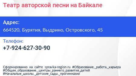 Театр авторской песни на Байкале по адресу 664520, Бурятия, Выдрино, Островского, 45 в дальнейшем Организация, размещена в следующих категориях: