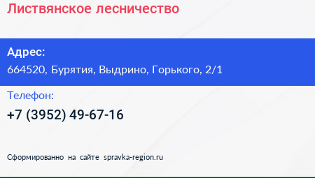Листвянское лесничество по адресу 664520, Бурятия, Выдрино, Горького, 2/1 в дальнейшем Организация, размещена в следующих категориях: