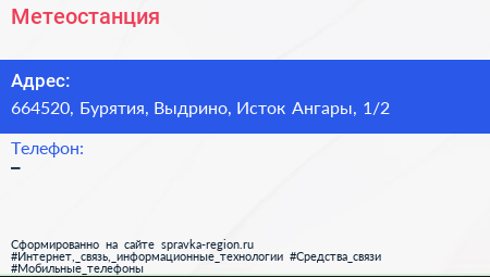 Метеостанция по адресу 664520, Бурятия, Выдрино, Исток Ангары, 1/2 в дальнейшем Организация, размещена в следующих категориях: