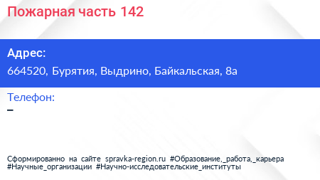 Пожарная часть №142 по адресу 664520, Бурятия, Выдрино, Байкальская, 8а в дальнейшем Организация, размещена в следующих категориях: