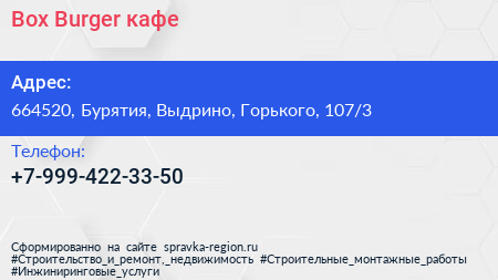 Box Burger, кафе по адресу 664520, Бурятия, Выдрино, Горького, 107/3 в дальнейшем Организация, размещена в следующих категориях:
