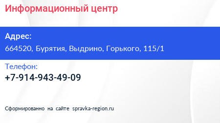 Информационный центр по адресу 664520, Бурятия, Выдрино, Горького, 115/1 в дальнейшем Организация, размещена в следующих категориях:
