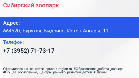 Сибирский зоопарк по адресу 664520, Бурятия, Выдрино, Исток Ангары, 11 в дальнейшем Организация, размещена в следующих категориях:
