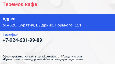 Теремок, кафе по адресу 664520, Бурятия, Выдрино, Горького, 111 в дальнейшем Организация, размещена в следующих категориях: