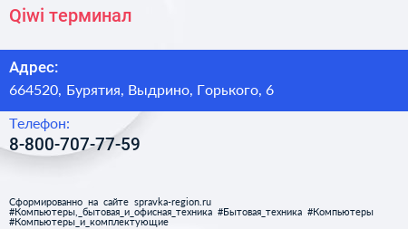 Qiwi, терминал по адресу 664520, Бурятия, Выдрино, Горького, 6 в дальнейшем Организация, размещена в следующих категориях: