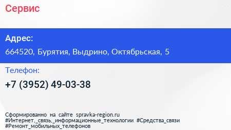 Сервис по адресу 664520, Бурятия, Выдрино, Октябрьская, 5 в дальнейшем Организация, размещена в следующих категориях: