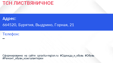 ТСН ЛИСТВЯНИЧНОЕ по адресу 664520, Бурятия, Выдрино, Горная, 21 в дальнейшем Организация, размещена в следующих категориях:
