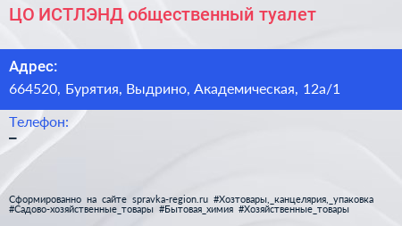 ЦО ИСТЛЭНД, общественный туалет по адресу 664520, Бурятия, Выдрино, Академическая, 12а/1 в дальнейшем Организация, размещена в следующих категориях:
