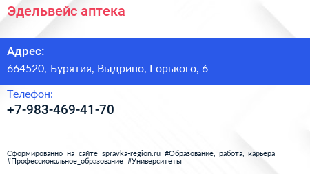 Эдельвейс, аптека по адресу 664520, Бурятия, Выдрино, Горького, 6 в дальнейшем Организация, размещена в следующих категориях: