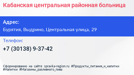 Кабанская центральная районная больница по адресу Бурятия, Выдрино, Центральная улица, 29 в дальнейшем Организация, размещена в следующих категориях: