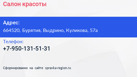 Салон красоты по адресу 664520, Бурятия, Выдрино, Куликова, 57а в дальнейшем Организация, размещена в следующих категориях: