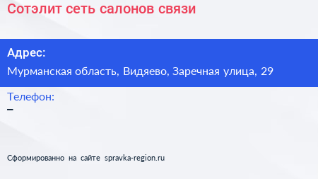 Сотэлит, сеть салонов связи по адресу Мурманская область, Видяево, Заречная улица, 29 в дальнейшем Организация, размещена в следующих категориях: