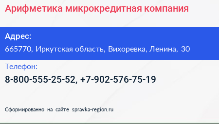 Арифметика, микрокредитная компания по адресу 665770, Иркутская область, Вихоревка, Ленина, 30 в дальнейшем Организация, размещена в следующих категориях: