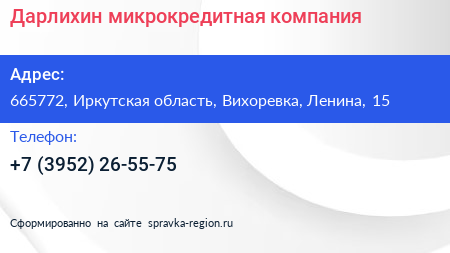 Дарлихин, микрокредитная компания по адресу 665772, Иркутская область, Вихоревка, Ленина, 15 в дальнейшем Организация, размещена в следующих категориях: