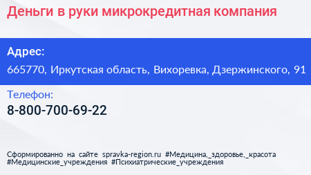Деньги в руки, микрокредитная компания по адресу 665770, Иркутская область, Вихоревка, Дзержинского, 91 в дальнейшем Организация, размещена в следующих категориях: