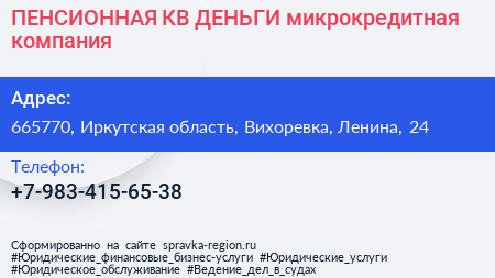 ПЕНСИОННАЯ КВ ДЕНЬГИ, микрокредитная компания по адресу 665770, Иркутская область, Вихоревка, Ленина, 24 в дальнейшем Организация, размещена в следующих категориях: