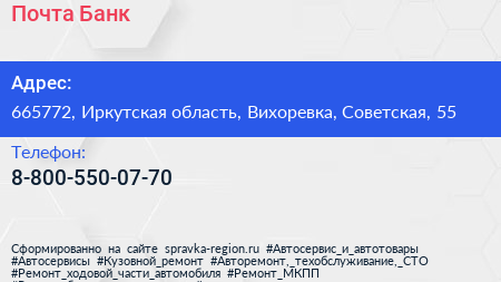 Почта Банк по адресу 665772, Иркутская область, Вихоревка, Советская, 55 в дальнейшем Организация, размещена в следующих категориях:
