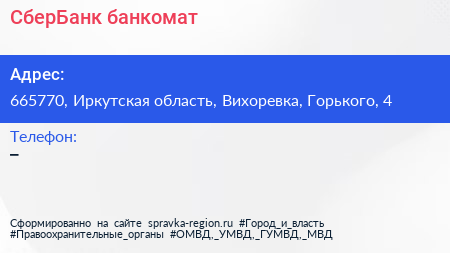 СберБанк, банкомат по адресу 665770, Иркутская область, Вихоревка, Горького, 4 в дальнейшем Организация, размещена в следующих категориях: