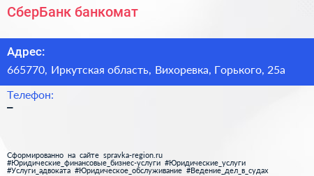 СберБанк, банкомат по адресу 665770, Иркутская область, Вихоревка, Горького, 25а в дальнейшем Организация, размещена в следующих категориях:
