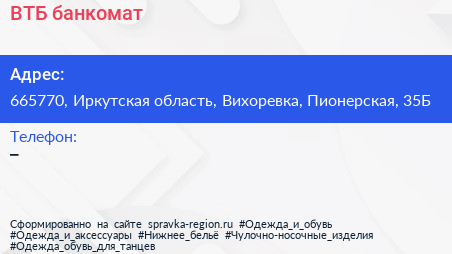 ВТБ, банкомат по адресу 665770, Иркутская область, Вихоревка, Пионерская, 35Б в дальнейшем Организация, размещена в следующих категориях: