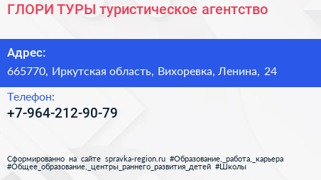 ГЛОРИ-ТУРЫ, туристическое агентство по адресу 665770, Иркутская область, Вихоревка, Ленина, 24 в дальнейшем Организация, размещена в следующих категориях: