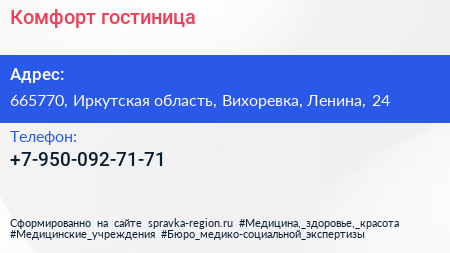 Комфорт, гостиница по адресу 665770, Иркутская область, Вихоревка, Ленина, 24 в дальнейшем Организация, размещена в следующих категориях: