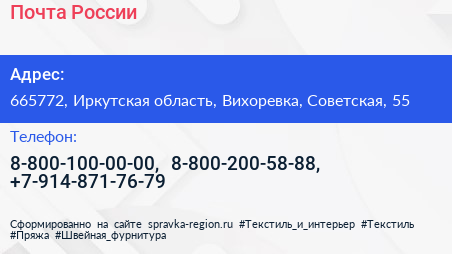 Почта России по адресу 665772, Иркутская область, Вихоревка, Советская, 55 в дальнейшем Организация, размещена в следующих категориях: