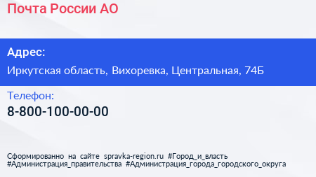 Почта России, АО по адресу Иркутская область, Вихоревка, Центральная, 74Б в дальнейшем Организация, размещена в следующих категориях: