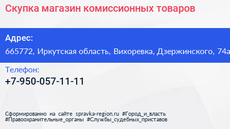 Скупка, магазин комиссионных товаров по адресу 665772, Иркутская область, Вихоревка, Дзержинского, 74а в дальнейшем Организация, размещена в следующих категориях: