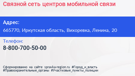 Связной, сеть центров мобильной связи по адресу 665770, Иркутская область, Вихоревка, Ленина, 20 в дальнейшем Организация, размещена в следующих категориях: