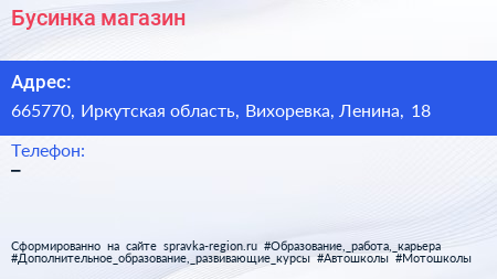 Бусинка, магазин по адресу 665770, Иркутская область, Вихоревка, Ленина, 18 в дальнейшем Организация, размещена в следующих категориях: