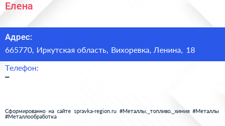 Елена по адресу 665770, Иркутская область, Вихоревка, Ленина, 18 в дальнейшем Организация, размещена в следующих категориях:
