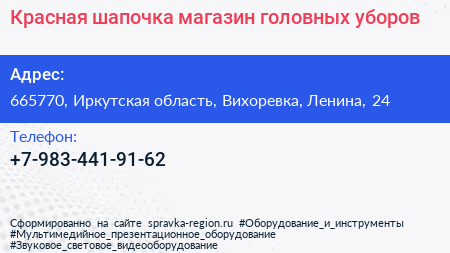Красная шапочка, магазин головных уборов по адресу 665770, Иркутская область, Вихоревка, Ленина, 24 в дальнейшем Организация, размещена в следующих категориях: